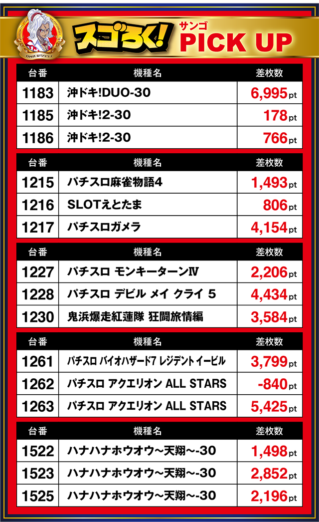 1183番台の「沖ドキ!DUO-30」から1186番台の「沖ドキ!2-30」の3台もプラスの結果に!