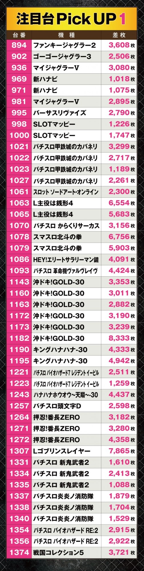 今回は機種を問わず様々な場所で好調台が目に付く結果となった。驚くべきことに全台プラスに加え、その全てが1,000枚オーバーという凄まじい内容で多くのプレイヤーを笑顔にさせていたようだ!