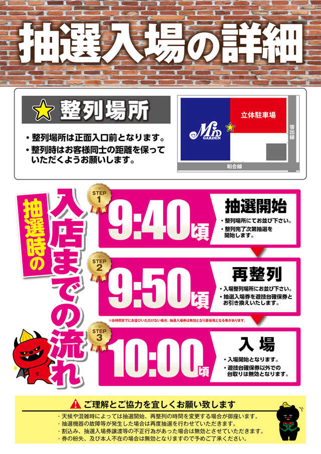 割り込み・抽選入場の譲渡は禁止致しております。この様な行為は発見次第、無効とさせていただきます。入場時、台確保券をお渡ししております。台確保券を台の見える位置に提示していただきます様ご協力をお願い致します。※開店から1時間以内は食事休憩をご遠慮いただいております。 |