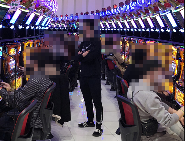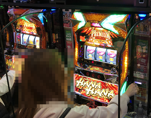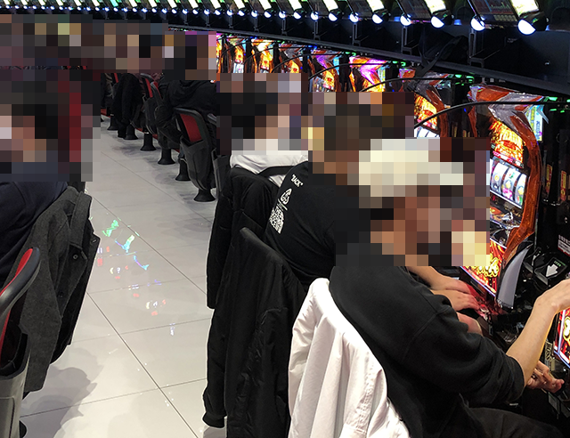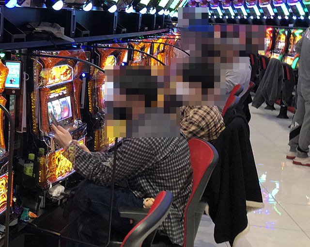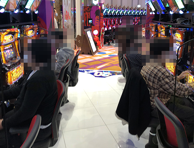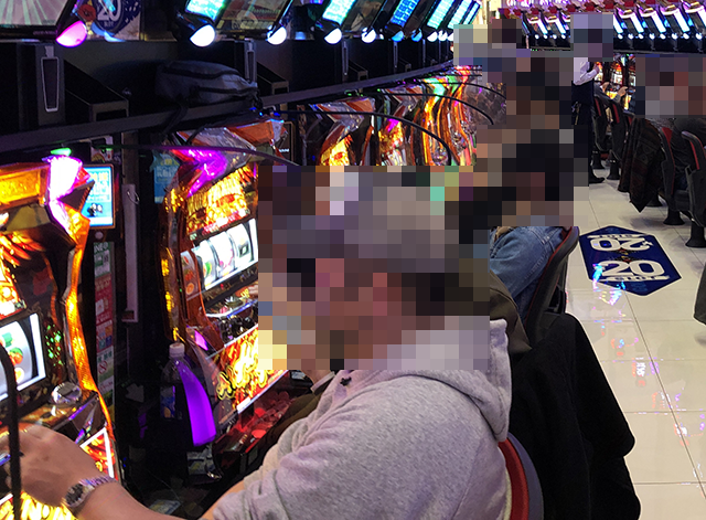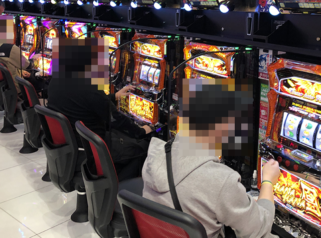 ハナハナシリーズのなかで設置台数がもっとも多い「プレミアムハナハナ-30」をみると、イキイキと遊技をおこなっているプレイヤーがズラリと並んでいた。