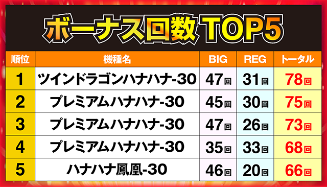 上位3台は70回を超えており、78回を記録した「ツインドラゴンハナハナ-30」の1台が首位を獲得した。