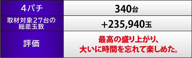 出玉性能・継続性能ともに兼ね備えた人気機種『P牙狼 月虹ノ旅人』は、全27台の総差玉数+235,940玉を記録!平均差玉数も+8,739玉となっており、上表を見ても万発OVERが乱舞する熱狂ぶりを披露していた。ファン一人ひとりが快適に打ち込む姿も印象的で、店内の盛り上がりを牽引した存在と言っても過言ではないだろう。