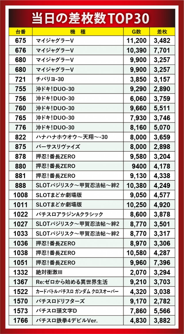 『マイジャグラーV』『SLOTバジリスク~甲賀忍法帖~絆2』『SLOT劇場版 魔法少女まどか☆マギカ[前編]始まりの物語/[後編]永遠の物語』『押忍!番長ZERO』の4機種で万回転を突破しているのが鮮烈だ。さらには3千枚OVERが多発し、5千枚OVERや7千枚OVERも発生するなど、幅広い機種でチャンスが存在していた。1日を通して打ち続けたファンは、とても有意義な時間を過ごしていたのではないだろうか。
