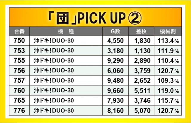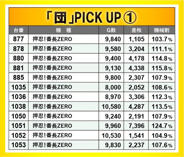 『押忍!番長ZERO』では877~881番台・1050~1053番台のように、横並び好況スポットが複数存在していた様子が窺える。いずれもしっかりとプラス差枚を記録し、より多くのゲーム数が回されるなど、納得のいく遊技ができなのではないだろうか。『沖ドキ!DUO-30』も然りで、776番台+5,070枚が先頭に立って熱気を放っては、ハイビスカスの輝きで島を明るく照らしていた。