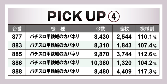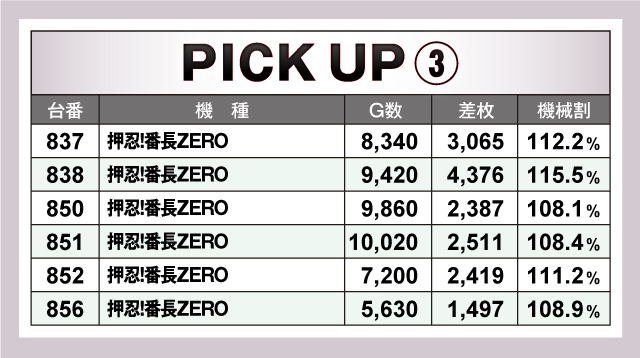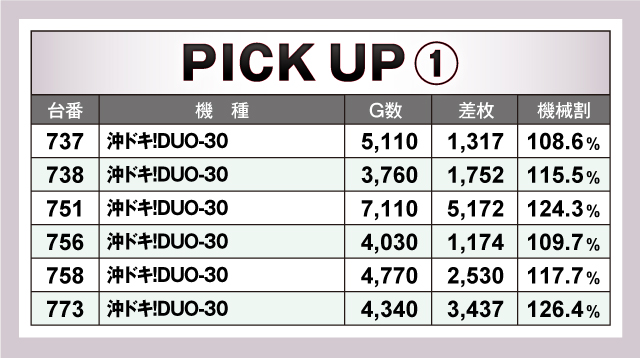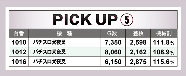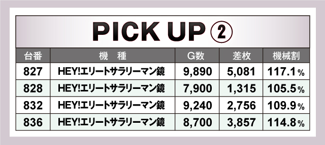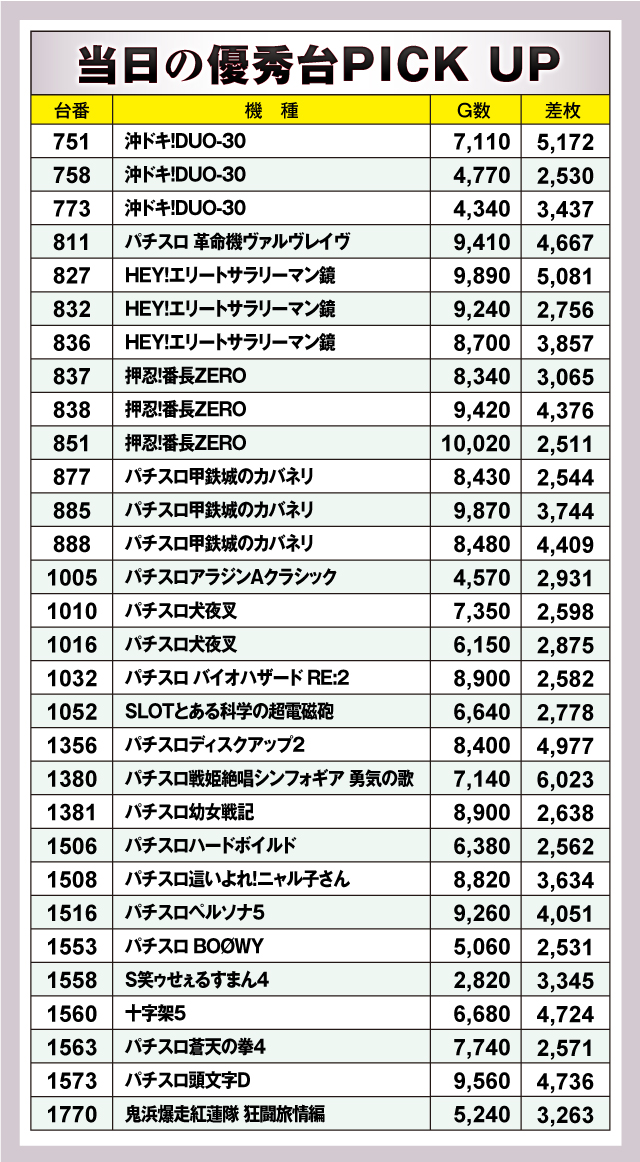 続いては、特に良台があった機種を紹介していこう。「沖ドキ!DUO-30」は751番台の+5,172枚を筆頭に4ケタオーバーの台が続出! また、上でも紹介した通り「HEY!エリートサラリーマン鏡」はどの台も優秀で、終日ぶん回し状態が続いてた。その他「押忍!番長ZERO」「パチスロ甲鉄城のカバネリ」「パチスロ犬夜叉」もベースが高そうな良結果を残していた!