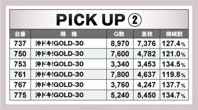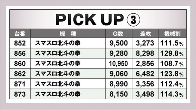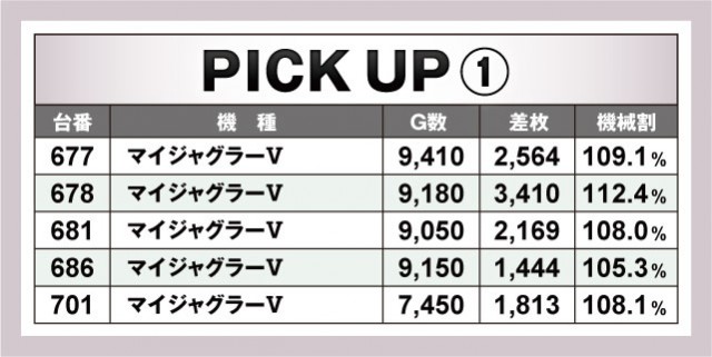 ピックアップは3か所。『マイジャグ』『沖ドキ!』『北斗』は『ミッド・ガーデン堀之内店』のメイン機種と言っていいだろう。その優秀台をさらに詳細に記載している。どの台がどれくらいの差枚数と機械割だったのか把握しておこう。