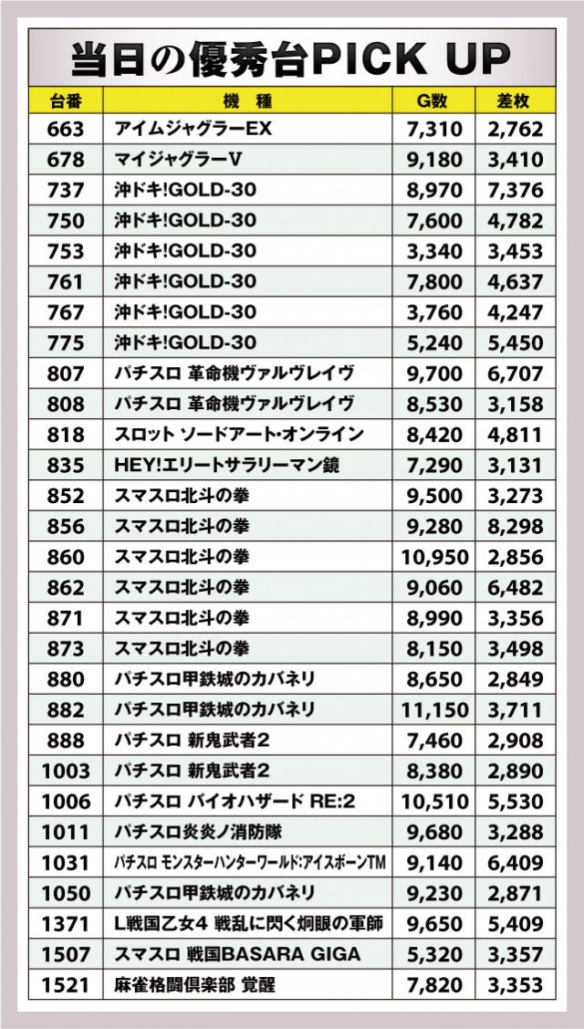 今回の優秀台はご覧の通り。やはり人気機種に優秀台が集中しているのか『沖ドキ!GOLD-30』と『スマスロ北斗の拳』がそれぞれ6台ずつ選出されている。差枚数的にも856番台がトップ差枚数を記録しており8,298枚。続いて737番台が7,376枚となっており、十二分な結果と言っていいだろう。『沖ドキ』と『北斗』以外では『パチスロ 革命機ヴァルヴレイヴ』の807番台、『パチスロ モンスターハンターワールド:アイスボーンTM』の1031番台も6,000枚オーバー! まさに見所満載の「英雄」となった。