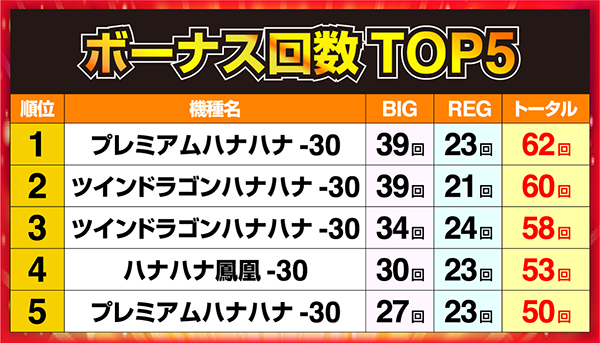 2位には、ボーナス回数60回を記録した「ツインドラゴンハナハナ‐30」の1台がランクインした。