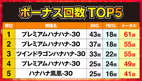 ボーナス回数61回を記録した「プレミアムハナハナ-30」の1台が首位を獲得!