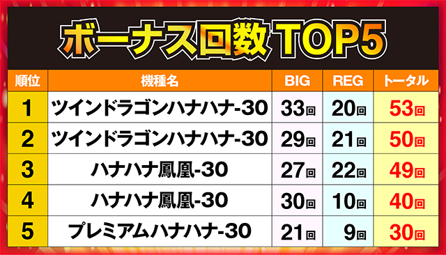 50回以上のボーナスに当選した「ツインドラゴンハナハナ-30」が1位と2位に入賞!
