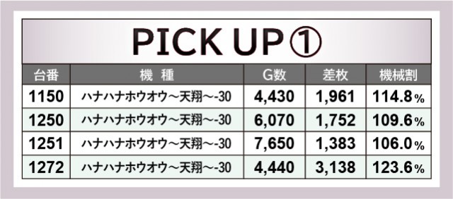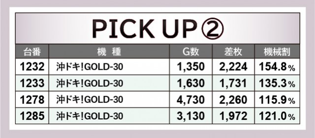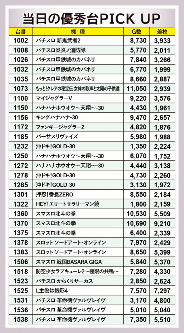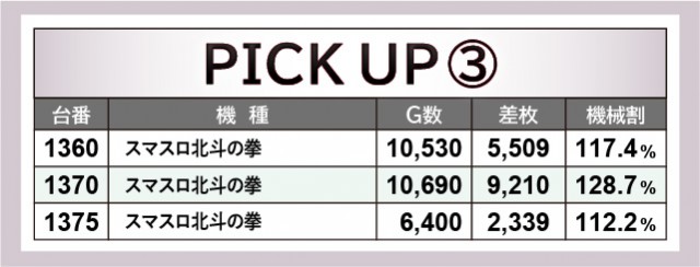 『ハナハナホウオウ~天翔~-30』は導入から根強い人気を誇り、『沖ドキ!GOLD-30』もまた回転数が少ないながらも結果を残している。これら沖スロ機種の存在も見逃せず、閉店まで遊技される状況となれば、より大きな数字を打ち立てたことだろう。『スマスロ北斗の拳』1370番台+9,210枚のように大きな熱気を放つことで、館内全体の盛り上がりがさらに昇華されるのは間違いない。