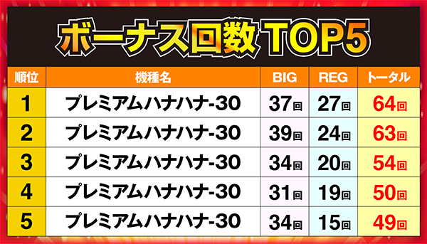 上位2台のボーナス回数が60回を超えており、僅差で64回を記録した台がトップに輝いた。