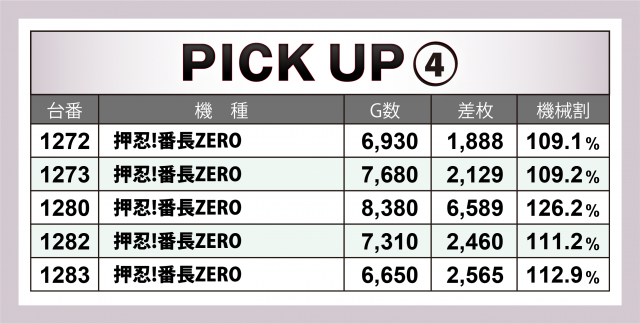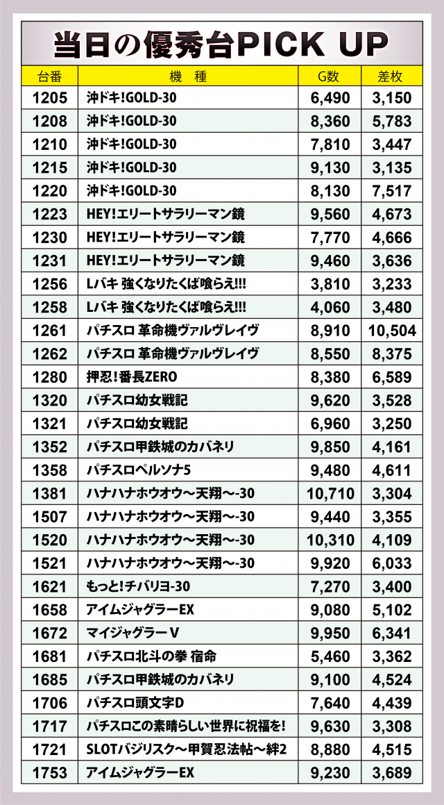 続いては好調5機種26台をチェック。何と言っても外せないのは『パチスロ 革命機ヴァルヴレイヴ』で、+万枚オーバー台×1&+8千枚超×1を輩出し、3台合計で+2万枚を突破した。また『沖ドキ!GOLD-30』では+7千枚突破台、『押忍!番長ZERO』『ハナハナホウオウ~天翔~-30』では+6千枚突破台をそれぞれ輩出。さらに『HEY!エリートサラリーマン鏡』では+4千枚オーバー台×2で6台合わせて+1万9千枚目前と、5機種がフルパワーを誇ることに成功した。