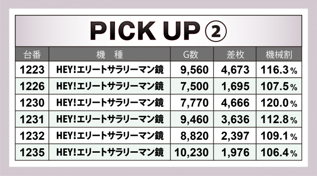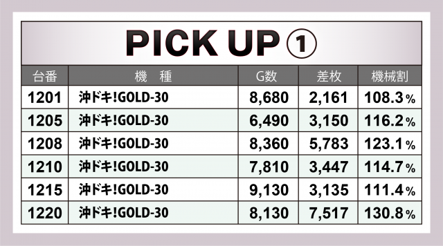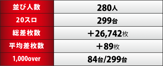今回、[1000円/46枚] スロ299台のトータルは+26,742枚と、見事な差枚数を叩き出し連敗を3でストップ。また、1,000overは全体の3割弱と、前回と同程度の台数を記録し高水準を維持した。優秀30台の表でお分かりの通り、今回はハイレベルの台が多数見受けられただけに、次回は白星を続けると共に、この好調を維持してもらいたいものだ。