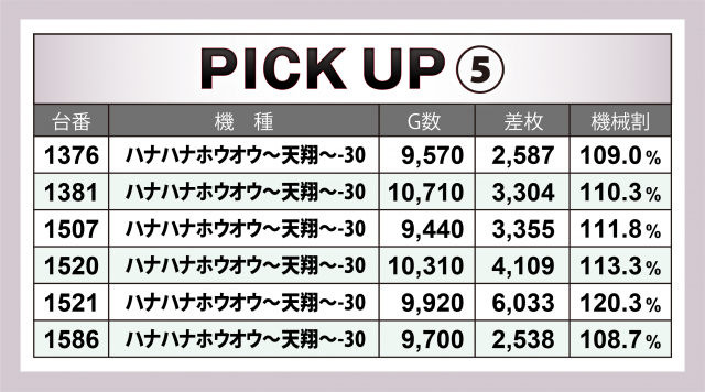 まずは優秀30台のPICK UPから。30台の全てが差枚数+3千枚以上を達成、+4千枚以上は16台、+5千枚オーバーは8台、+6千枚オーバーは5台と、かなりのハイクオリティぶりとなった。後述する好調5機種以外では、『アイムジャグラーEX』が+5千枚オーバーをマーク、『パチスロ甲鉄城のカバネリ』『パチスロペルソナ5』『パチスロ頭文字D』『SLOTバジリスク~甲賀忍法帖~絆2』の各台が+4千枚突破を記録した。