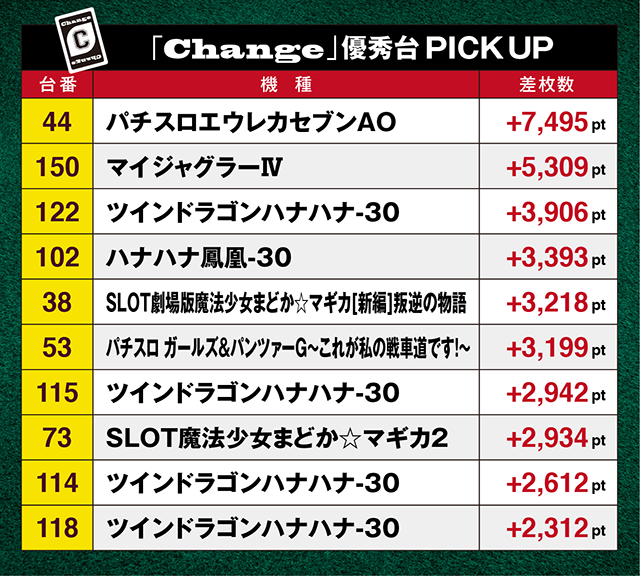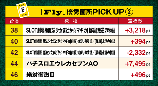 「パチスロエウレカセブンAO」の44番台は+7,495pt、「SLOT劇場版魔法少女まどか☆マギカ[新編]叛逆の物語」の38番台は+3,218ptと、多彩なスペックの機種が好成績を残した。