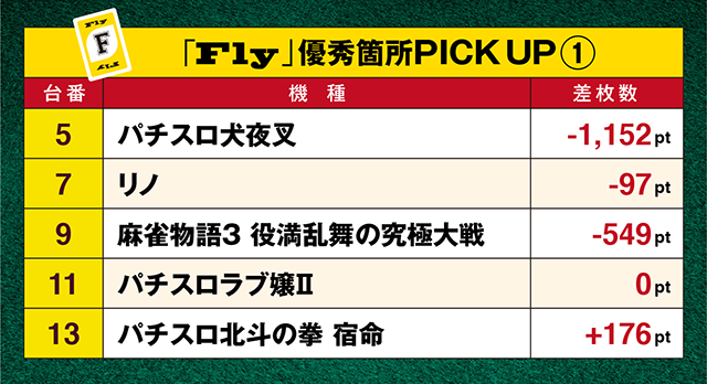 また、「パチスロ犬夜叉」や「パチスロ北斗の拳 宿命」などが設置されたシマでも、”Fly”と思われるポイントを発見した。