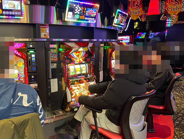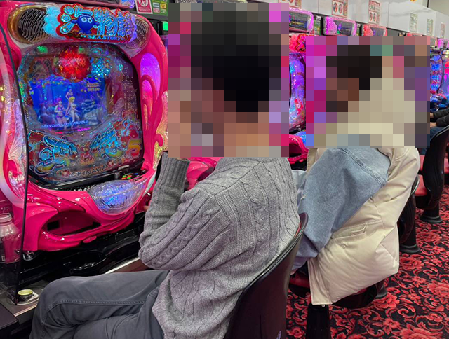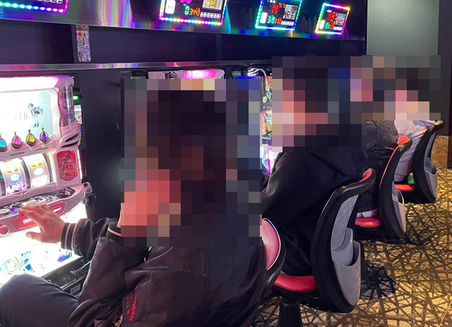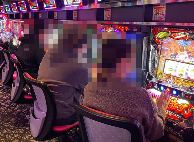 「マイジャグラーV」と「アイムジャグラーEX」のそれぞれに、うれしそうに遊技をおこなう姿が並び、明るい雰囲気が感じられたよ。