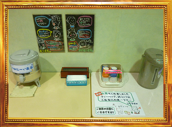 休憩スペースには、自由に飲めるお茶やサンドバッグなどが用意されている。説明書きにはイラストがついており、かわいらしさも感じられた。