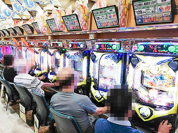 100円/89玉パチンコをチェックすると「P大工の源さん 超韋駄天 LIGHT」の盛り上がりが大きい。シマ全体に華やかな光景が広がっていた。