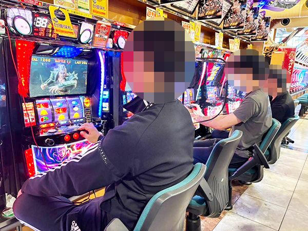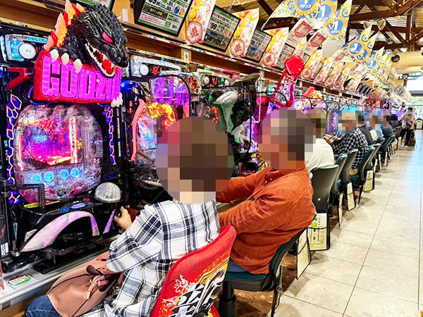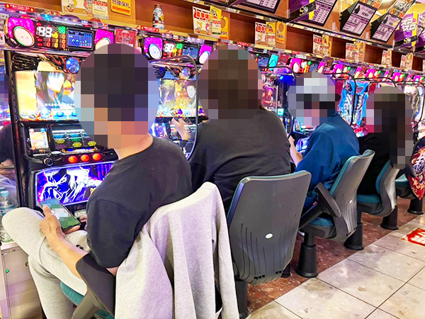 取材時は多くのプレイヤーが来店。パチンコ・パチスロともに、様々な機種が支持を得ていた。