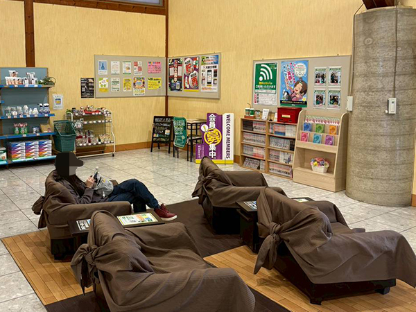 レストスペースには幅広いジャンルの漫画本が用意されており、取材時も満喫するプレイヤーが多かった。