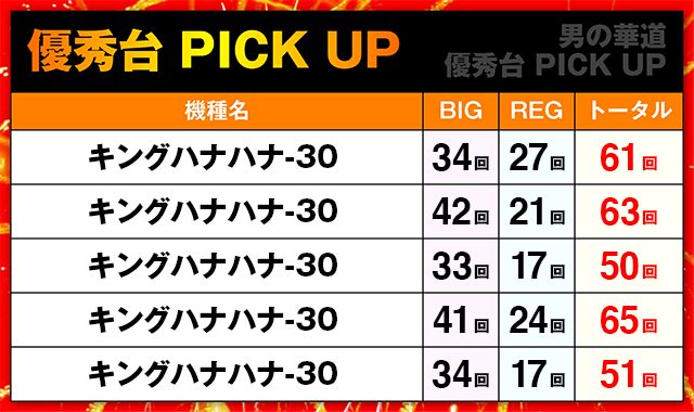 「キングハナハナ-30」から、ボーナス回数が50回以上の5台をチョイス。