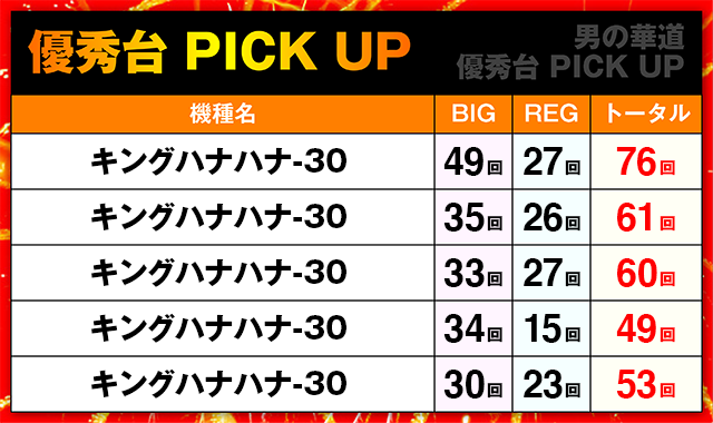3台のボーナス回数が60回以上を記録し、76回まで回数を伸ばした台もあった。