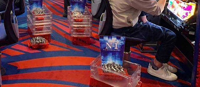 さらに『キングハナハナ-30』のシマでは頭上にギュウギュウメダルが詰まったドル箱が散見された。
