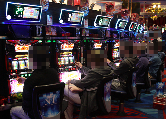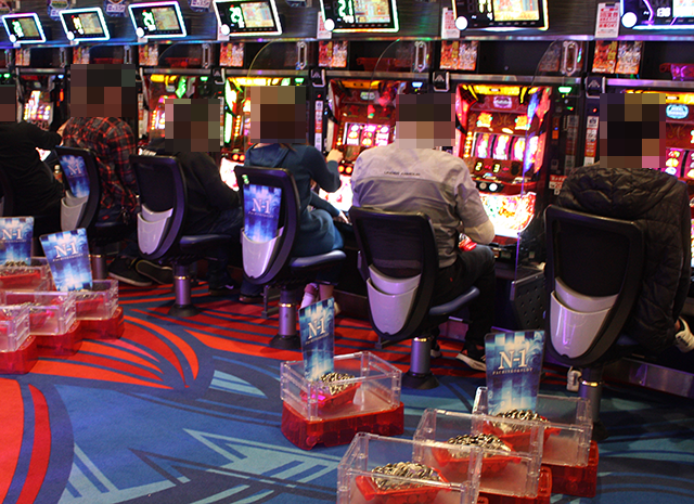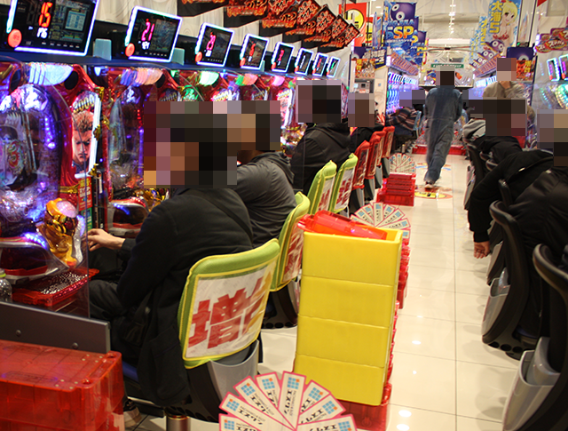 複数のプレイヤーが1箱以上の持ち玉で遊技を楽しんでおり、シマ全体に活気が満ちていた。