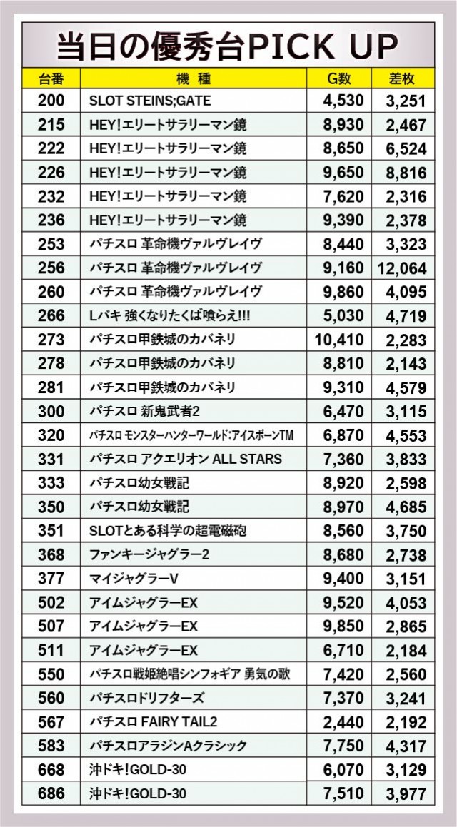 上表には幅広い機種名が名を連ねているが、その中で秀でた結果を残したのは、『パチスロ 革命機ヴァルヴレイヴ』256番台+12,064枚だった。スマスロの一撃=万枚OVERという大きな賑わいを披露し、さらには『HEY!エリートサラリーマン鏡』226番台+8,816枚という記録も鮮烈だ。また『ジャグラー』シリーズも安定したパフォーマンスを見せていた様子で、館内全体が活気と熱気に包まれていたと言えるだろう。