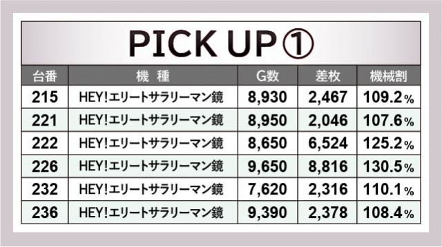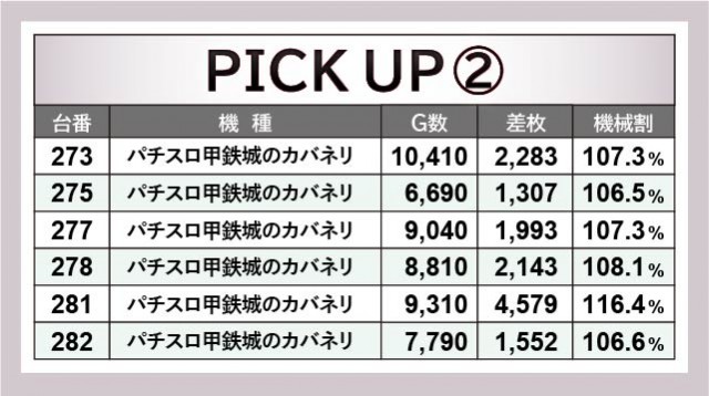 『HEY!エリートサラリーマン鏡』226番台+8,816枚という突出した記録が見られるが、他にも『パチスロ甲鉄城のカバネリ』281番台+4,579枚・『アイムジャグラーEX』502番台+4,053枚などの数字が目を惹く。いずれの機種も閉店まで打ち込まれており、ファンは相当な手ごたえを感じていた様子がハッキリと窺える。特に『パチスロ甲鉄城のカバネリ』は万回転OVERが発生している事実から、相当な好感触があったに違いない。
