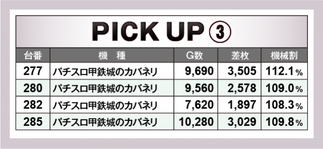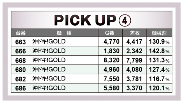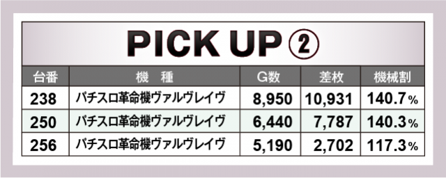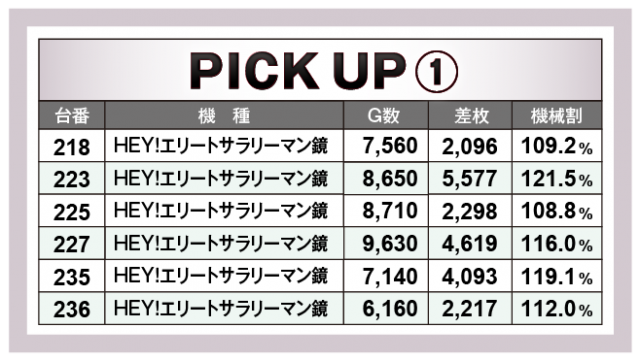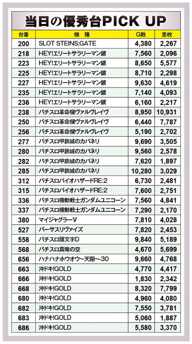 まずは優秀30台のPICK UPから。この日は30台のうち28台が差枚数+2千枚以上を達成、+3千枚以上が17台、+5千枚オーバーが6台となった。上表をご覧の通り人気機種が総なめする形となったわけだが、そのほか568番台の『パチスロ真俺の空』で+5,699枚、336番台の『パチスロ機動戦士ガンダムユニコーン』で+4,841枚、656番台の『ハナハナホウオウ~天翔~-30』で+4,768枚など様々な機種が好調ぶりを発揮していた。