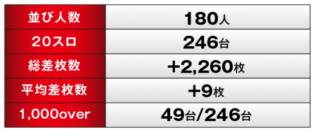 続いては好調機種4機種のピックアップについてみていこう。まず『HEY!エリートサラリーマン鏡』では+5,577枚を筆頭に6台のトータル差枚数が+2万枚オーバーを獲得!また、『パチスロ革命機ヴァルヴレイヴ』では238番台が万枚超えを記録し、スマスロ機の威力を見せつけていた。次いで『パチスロ甲鉄城のカバネリ』では、いずれも高回転を記録し、最後まで必死にレバーを叩き続けていた光景が想像できる。そして『沖ドキ!GOLD』では、+7,799枚を筆頭に6台のトータル差枚数が+2万5千枚オーバーと見事な活躍を見せつけ、各台とても打ち応えのある状況だったのは確かだ!