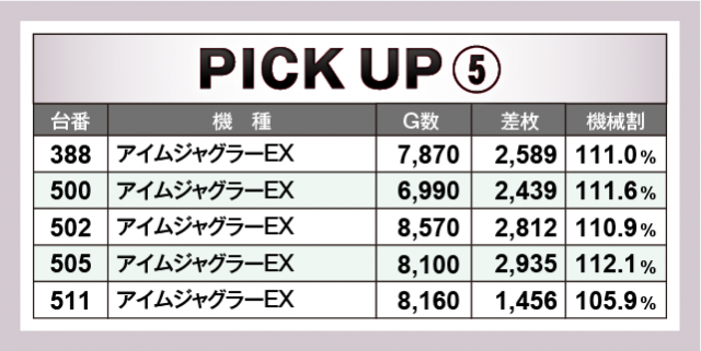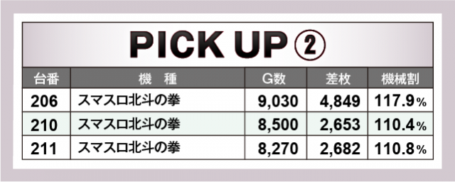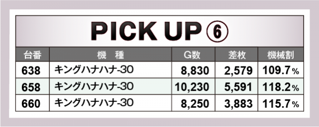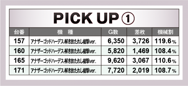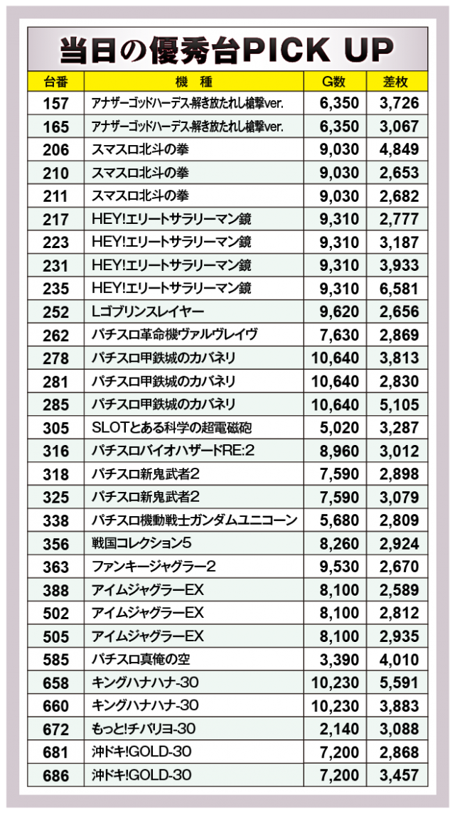 まずは優秀30台のPICK UPから。この日は30台全てが差枚数+2千枚以上を達成、+3千枚以上が16台、+4千枚オーバーが5台となった。後述する好調機種以外では、585番台の『パチスロ真俺の空』で+4,010枚、686番台の『沖ドキ!GOLD-30』で+3,457枚、305番台の『SLOTとある科学の超電磁砲』で+3,287枚などが光っていた。
