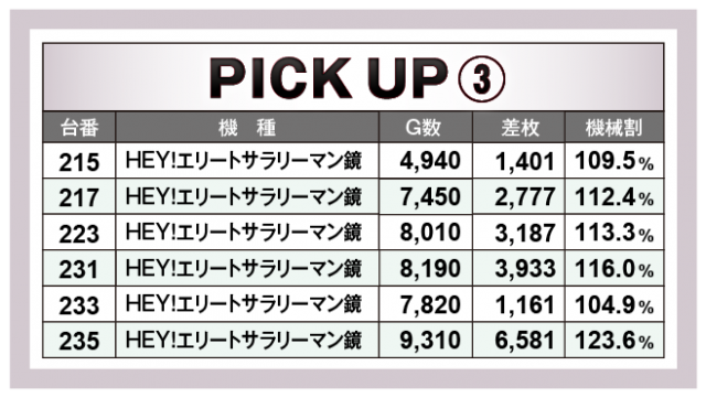 続いては好調機種6機種のピックアップ。突出して目立っていたのが、この日のトップ差枚数をマークした『HEY!エリートサラリーマン鏡』で、235番台の+6,581枚を筆頭に6台のトータル差枚数は+1万9千枚オーバーを獲得!また、『スマスロ北斗の拳』では3台のトータル差枚数が+1万枚オーバーとなり、共にスマスロ機の威力を存分に見せつけていた。そのほか最新台の『アナザーゴッドハーデス-解き放たれし槍撃ver.-』が4台の総差枚数+1万枚オーバー、不動の人気機種『パチスロ甲鉄城のカバネリ』でも3台のトータル差枚数が+1万枚オーバーをマーク。さらに老若男女問わず人気の『アイムジャグラーEX』では5台のトータル差枚数が+1万2千枚オーバー、『キングハナハナ-30』では658番台の+5,591枚を筆頭に3台のトータル差枚数が+1万2千枚オーバーと島全体が熱気と活気に溢れていた。いずれも朝からじっくりと打ち込まれていたのが印象的で、ファンも相当な手ごたえを感じていたに違いない。
