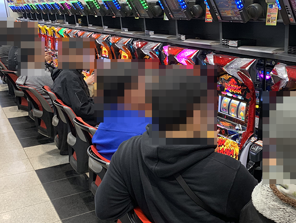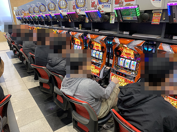 興味深そうにパチスロの画面を眺めている姿やイキイキとパチンコのハンドルを握っている姿など、「DAMZ木戸店」は随所が明るいムード。