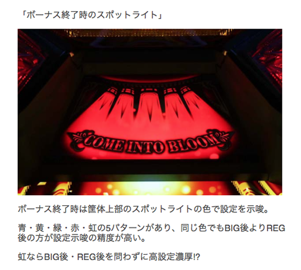 また、ボーナス終了後に光る筐体上部のスポットライトの色にも要注目だ。