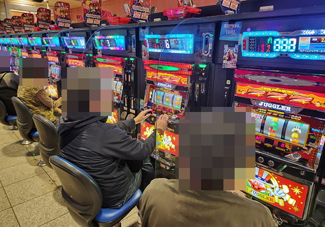 15時頃にパチスロの状況をうかがうと、ジャグラーシリーズに華やかな光景が広がっていた。