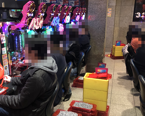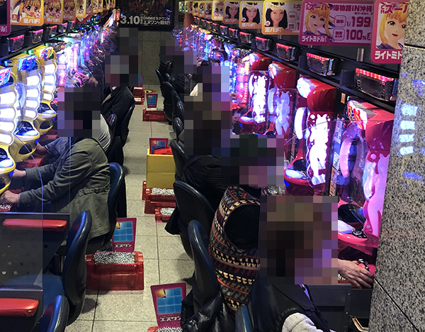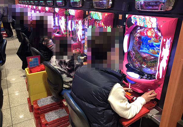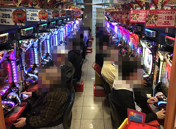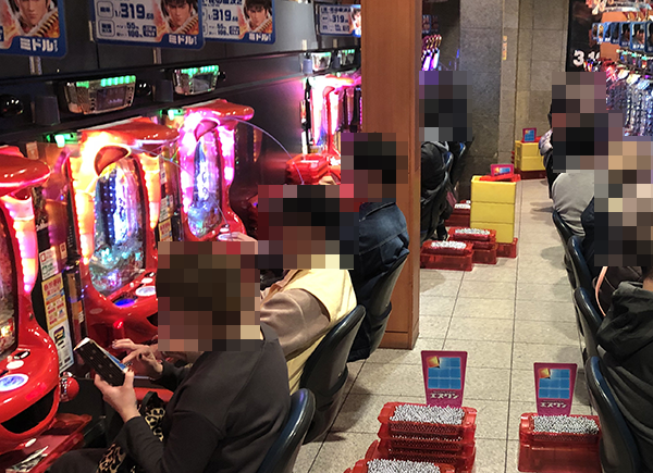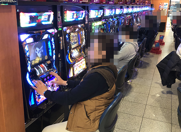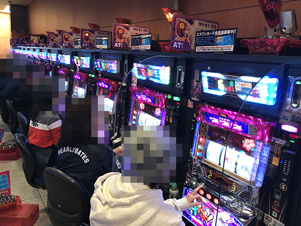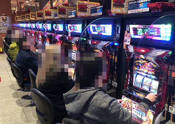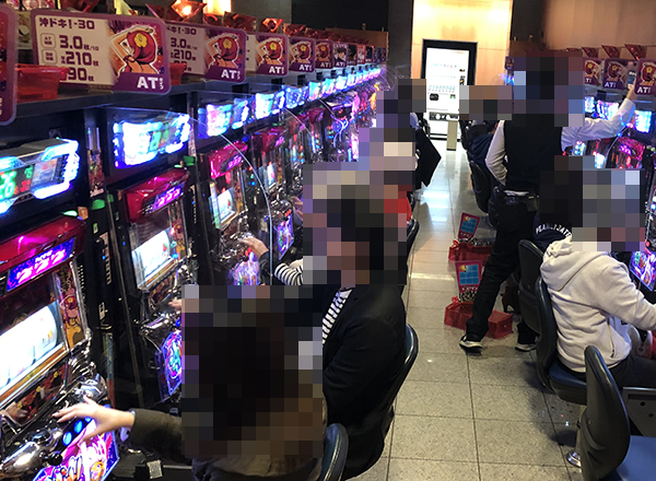たくさんのプレイヤーが集まる店内は、パチンコとパチスロの両方が盛況。明るい表情で遊技をおこなっているプレイヤーの姿は、戦国大名のような勇ましさがあった。
