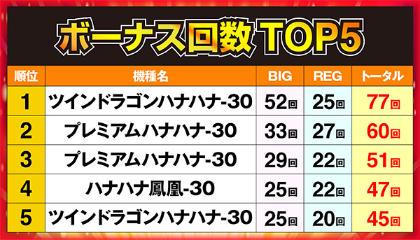 第1位に輝いたのは、ボーナス回数70回以上を記録した「ツインドラゴンハナハナ-30」の1台!!