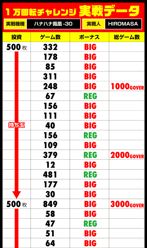 鳳凰の名にふさわしい連打だが、今回の目的は1万回転チャレンジ…。ボーナスの連打にくわえ、大きいコインですぐ満杯になる箱の処理もタイムロスとなり、真綿で首を絞められるようなプレッシャーがHIROMASAをおそう。