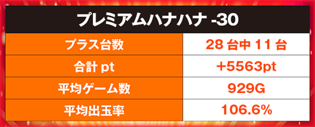 閉店時の平均ゲーム数は1000G未満と控えめであったが、合計ptは+5563pt。最終的には11台がプラスでこの日を終えた。