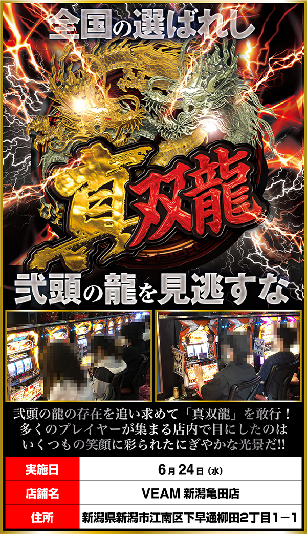 「ハナハナ鳳凰-30」と「プレミアムハナハナ‐30」を中心に活気づいていた「VEAM新潟亀田店」。魅力的なシーンが多い「真双龍」となった。
