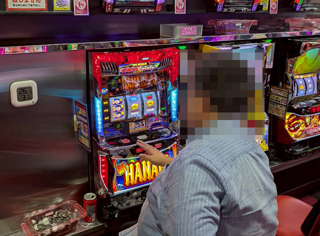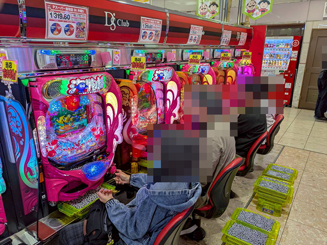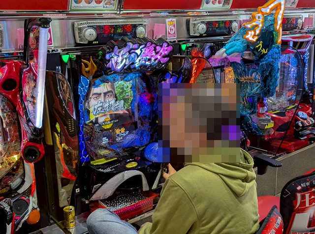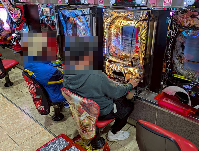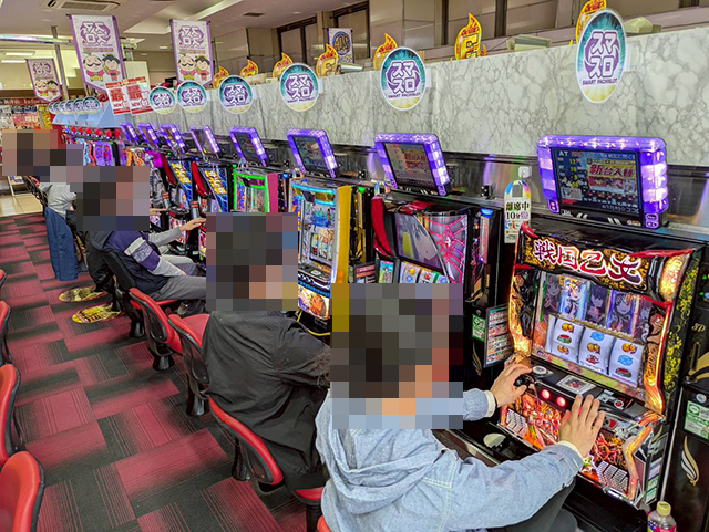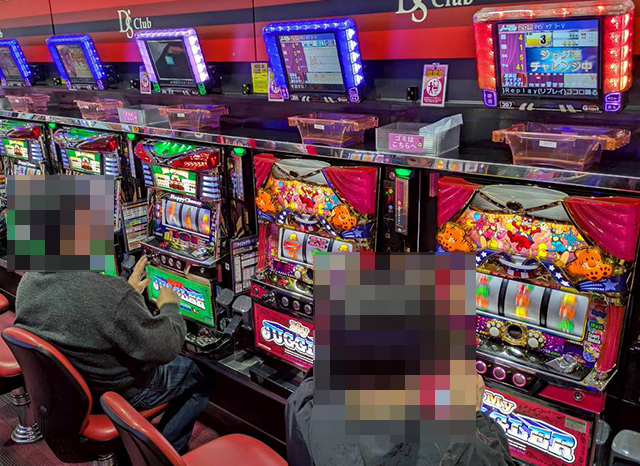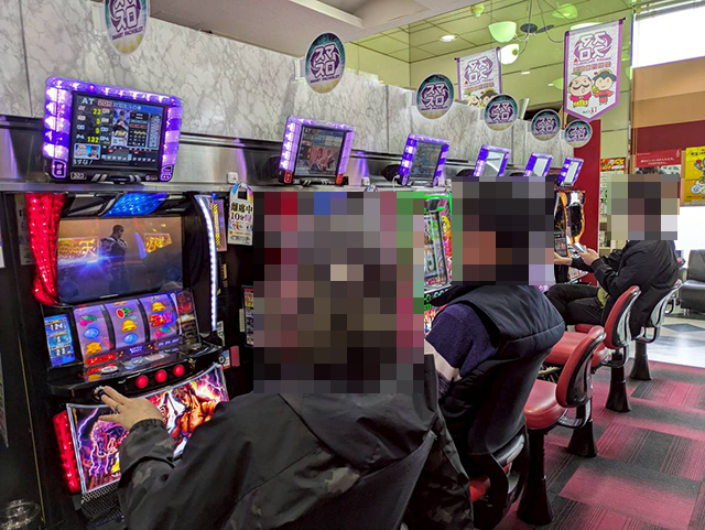 パチスロでは、2台設置の「スマスロ北斗の拳」に空き台がなく、どちらのプレイヤーも表情が明るい。