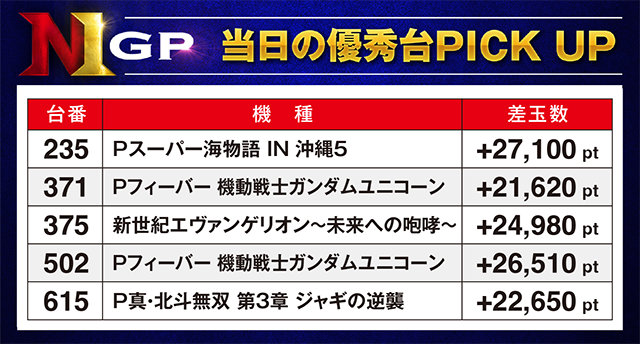 「Pスーパー海物語 IN 沖縄5」の235番台が+27,100pt、「Pフィーバー 機動戦士ガンダムユニコーン」は2台が+20,000pt超など、迫力のある光景が随所にみられた。