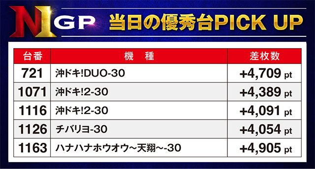 「沖ドキ!2-30」や「沖ドキ!DUO-30」といった沖ドキシリーズは、複数の台が+4,000pt以上を記録した。
