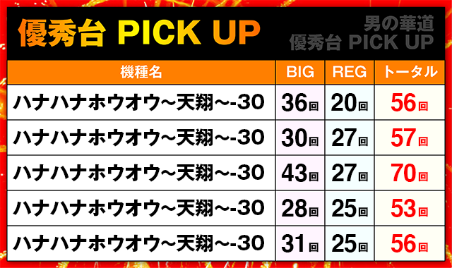トータルで70回を記録した台を筆頭に、5台を厳選した。