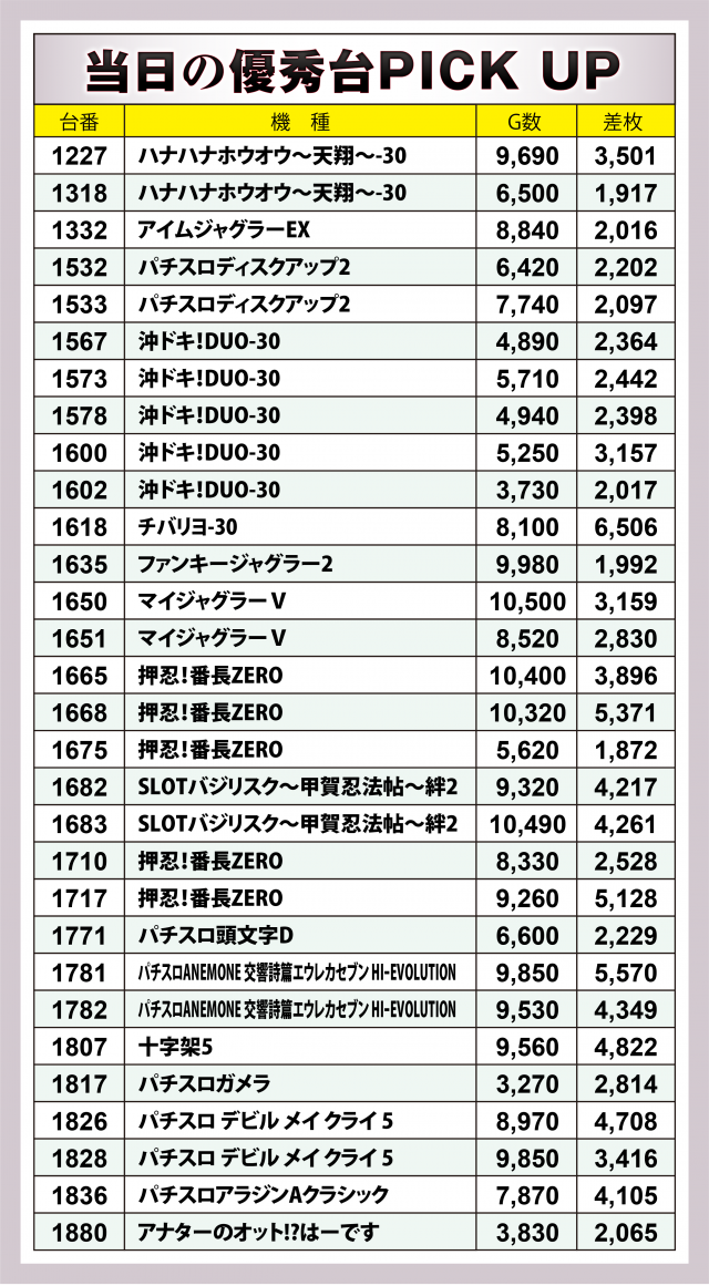 まずは優秀30台のPICK UPから。うち27台が差枚数+2千枚以上、さらに15台が+3千枚以上となった。また+5千~4千枚クラスがゴロゴロ、最高は『チバリヨ-30』の+6千枚突破台だった。後述する好調5機種以外では、『SLOTバジリスク~甲賀忍法帖~絆2』『パチスロANEMONE 交響詩篇エウレカセブン HIーEVOLUTION』『パチスロ デビル メイ クライ 5』がそれぞれ2台ずつで合計プラス差枚数+8千枚超え!