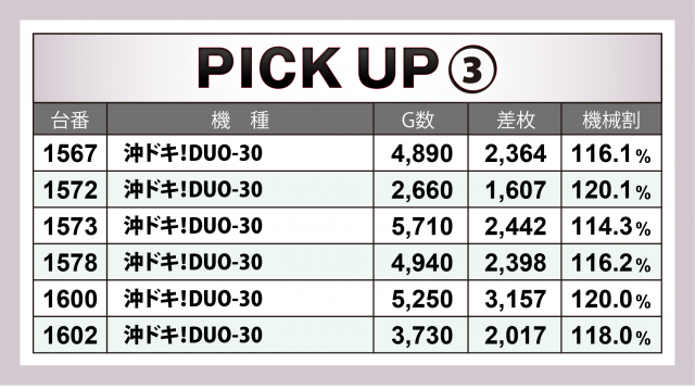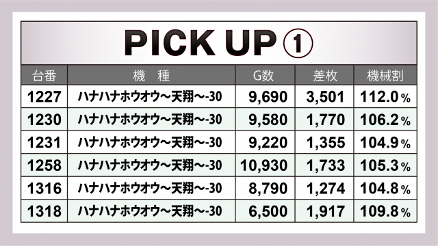 続いてはこの日の好調5機種計27機種。特に優れていたのが『押忍!番長ZERO』で、5台トータル+1万9千枚弱&1台あたりの平均は+3千8百枚弱! 他にも『ハナハナホウオウ~天翔~-30』『沖ドキ!DUO-30』が共に6台合計で+1万枚オーバーを達成した。